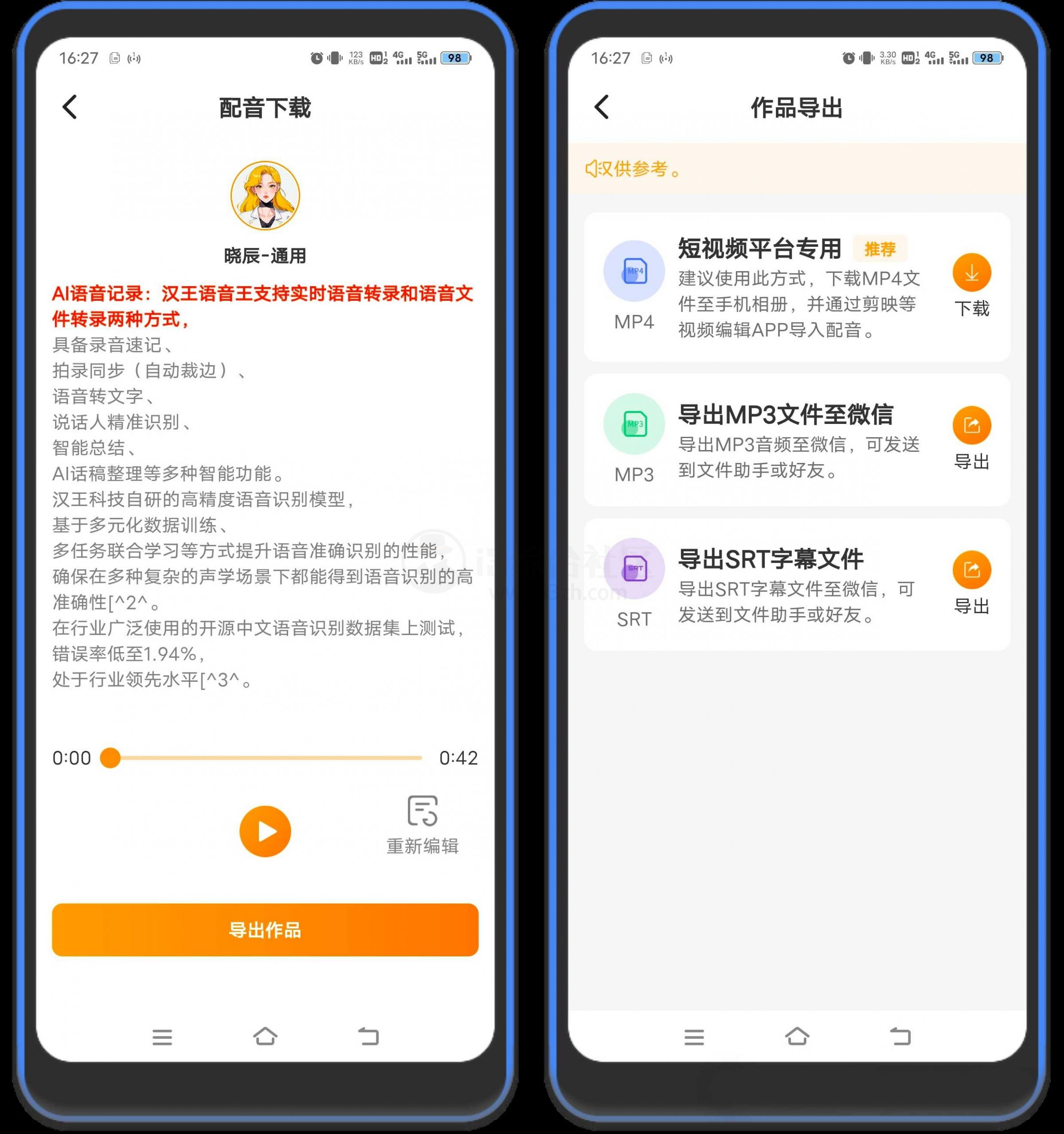 转换完成可以试听,支持导出多种格式,MP4,MP3,STR字幕文件,在剪辑创作时候能省不少事。