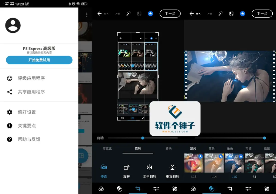 软件提供了多种场景效果,如漏光、散景、杂色、雨滴、纸张、星空、水彩等。只需一键操作,即可为图片增添独特的氛围,快速完成创意。