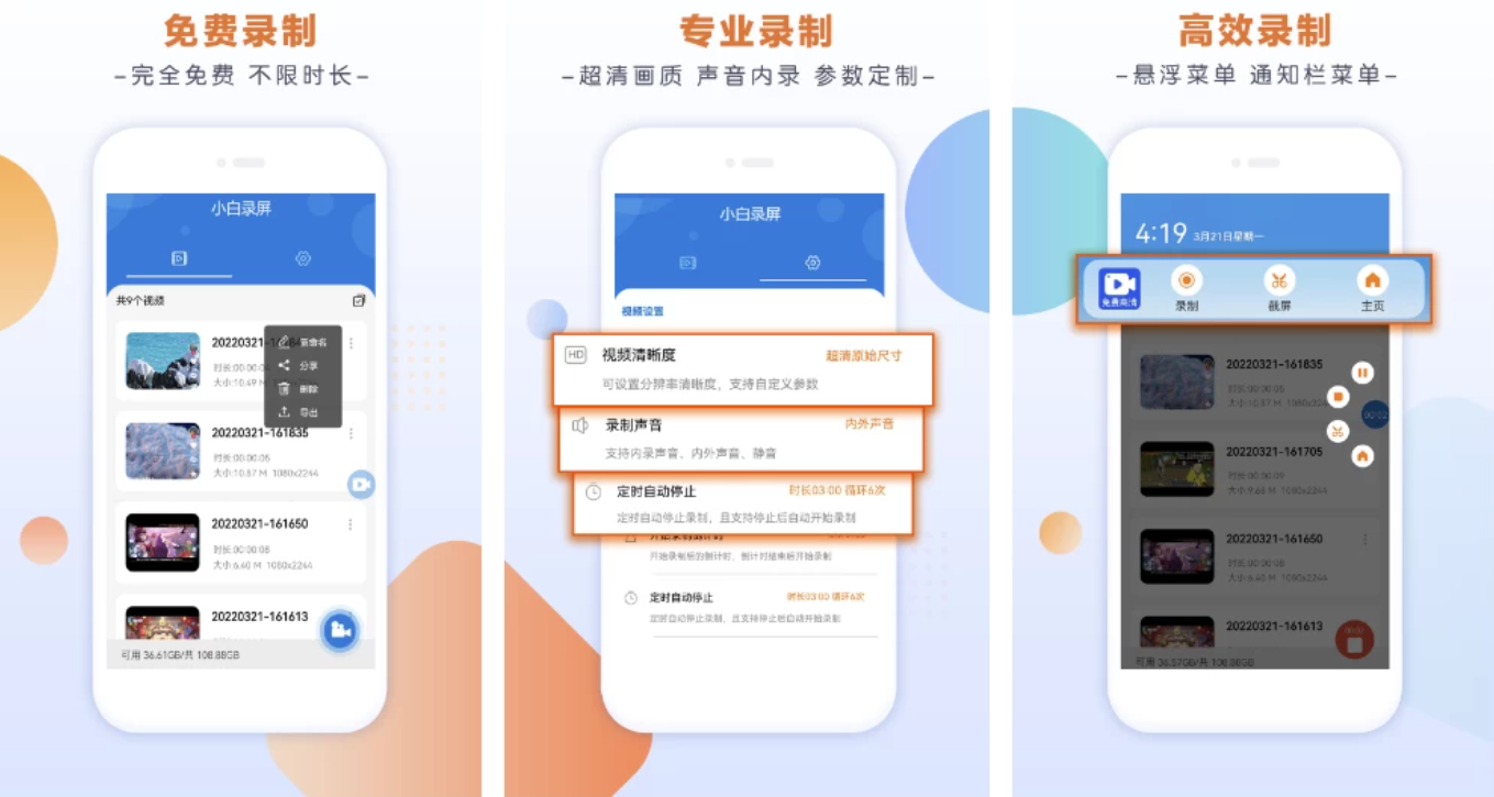 小白录屏APP功能强大,以超清、免费、导出超快,无水印、不限时长、无需root、声音内录、等强大技术,让工具更简单。